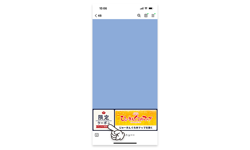 LINE公式アカウントのメニューにある「限定クーポン」ボタンをタップして、クーポン一覧ページへアクセス。