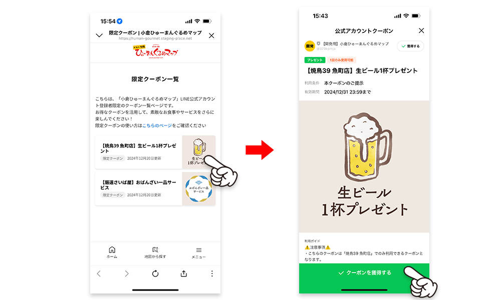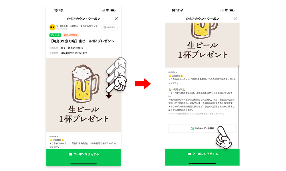 - 限定クーポン利用時は店舗の方の案内に従い「クーポンを使用する」をタップしてください