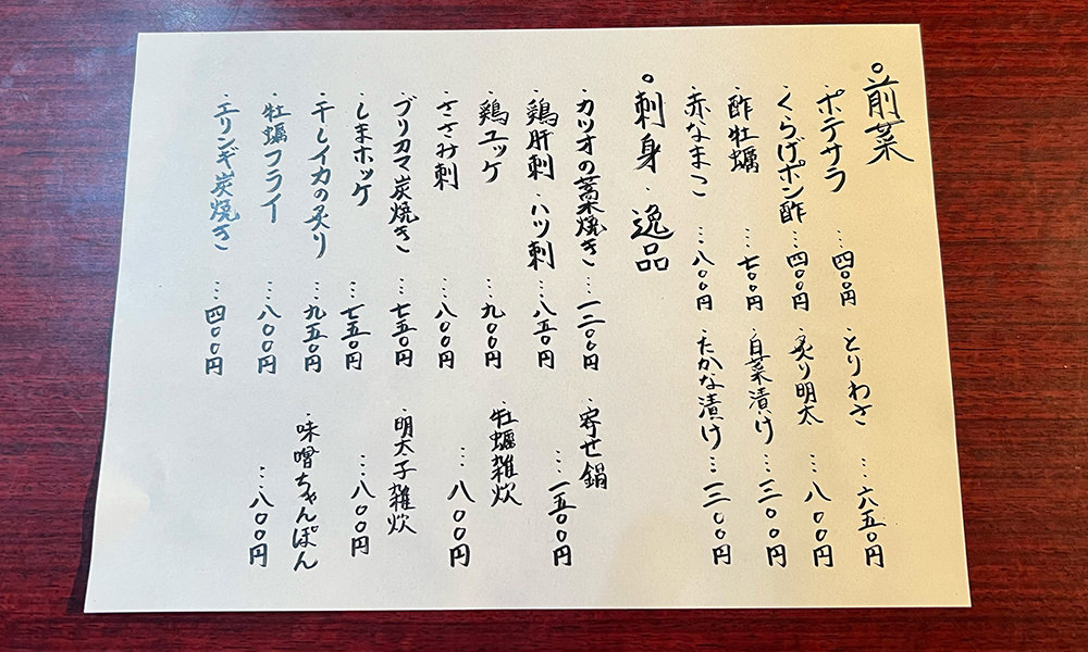 「本日のおすすめ」は、大将がその日市場で仕入れた新鮮な食材を使った特別な一品。